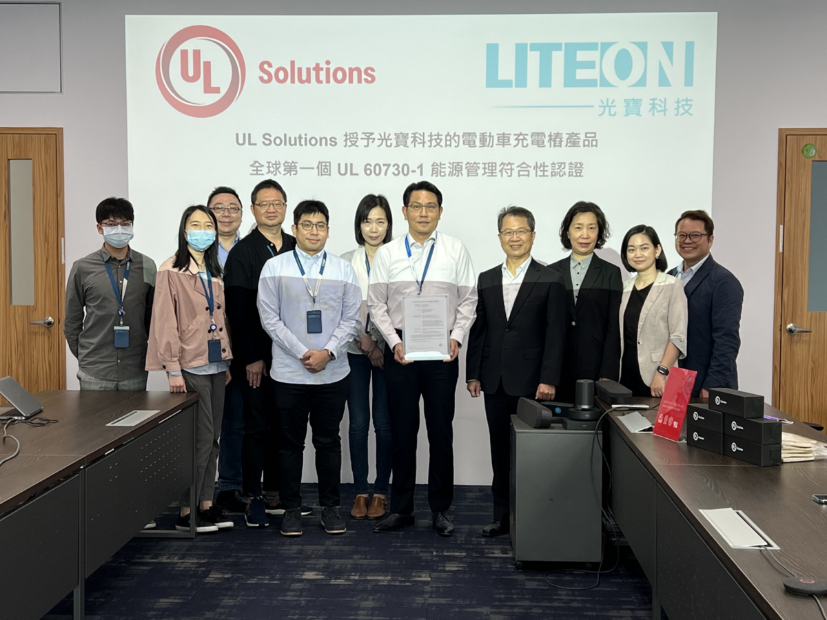 近日,UL Solutions 颁发了全球第一张电动车充电桩产品的 UL 60730-1 能源管理符合性认证证书。该证书获得者为光宝科技股份有限公司 (LITEON Technology,以下简称“光宝科技”) 。 颁证仪式在台北举办,UL Solutions 副总裁兼台湾总经理陈宗弘,光宝科技动力储能产品事业处处长李明修等双方代表出席。