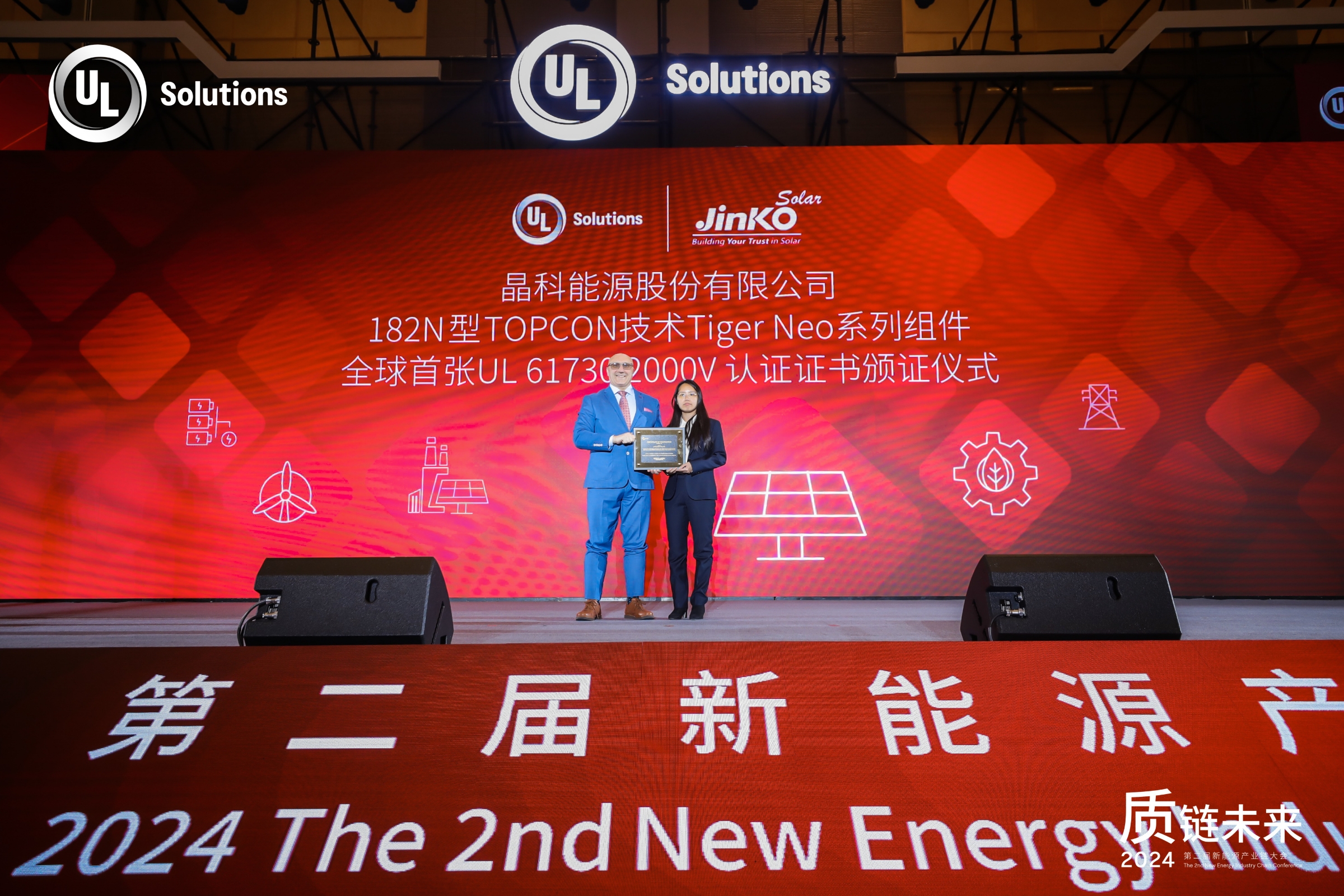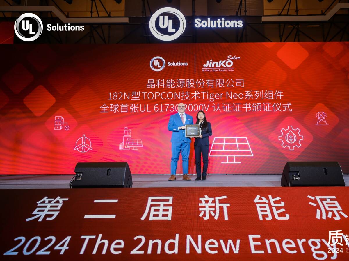 UL Solutions于2024年2月正式发布UL 61730关于2000V光伏组件的认证要求决议。晶科能源也成为了全球首张UL 61730 2000V认证证书的获得者。该公司的182 N型Tiger Neo系列组件通过了一系列严格的安全和性能评估,满足2000V的系统电压安全使用要求,可用于2000V的高电压应用场景。
