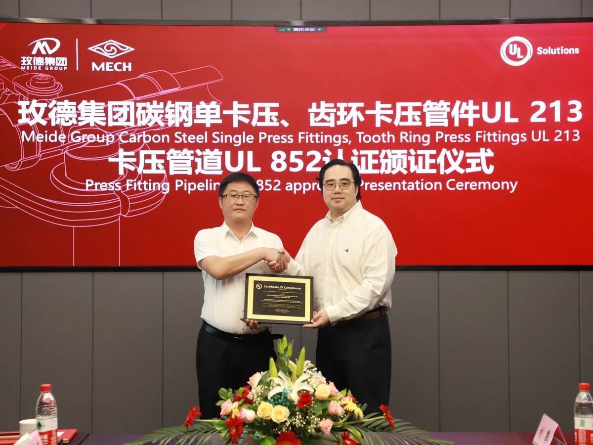 UL Solutions建筑环境安全科技事业部亚洲区运营总监许洁在颁证仪式上表示:“祝贺玫德集团顺利完成碳钢卡压管件和管道产品的UL认证。玫德集团作为流体输送行业的龙头企业,一直以来非常重视产品研发和品质管控。在和UL合作的20余年间,玫德集团的产品扩展到系统的多个方面。此次卡压类产品获证使得玫德集团成为中国首家取得UL认证的卡压管件和管道企业,这也将对行业产生更加积极的影响。衷心祝愿玫德集团的出口业务蒸蒸日上,期待未来一同见证中国制造赢得更多的国际认可,走向更广阔的全球市场。”