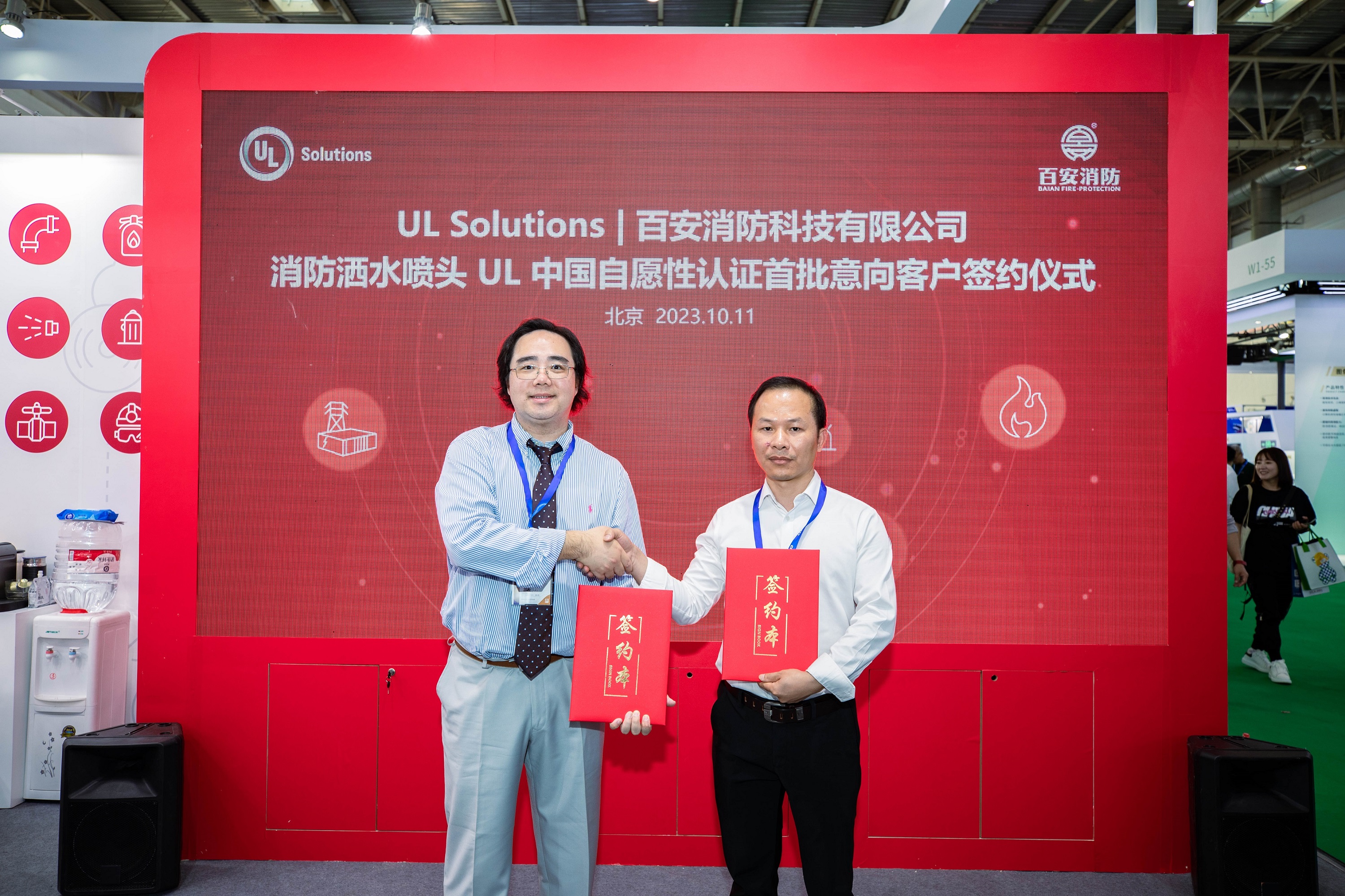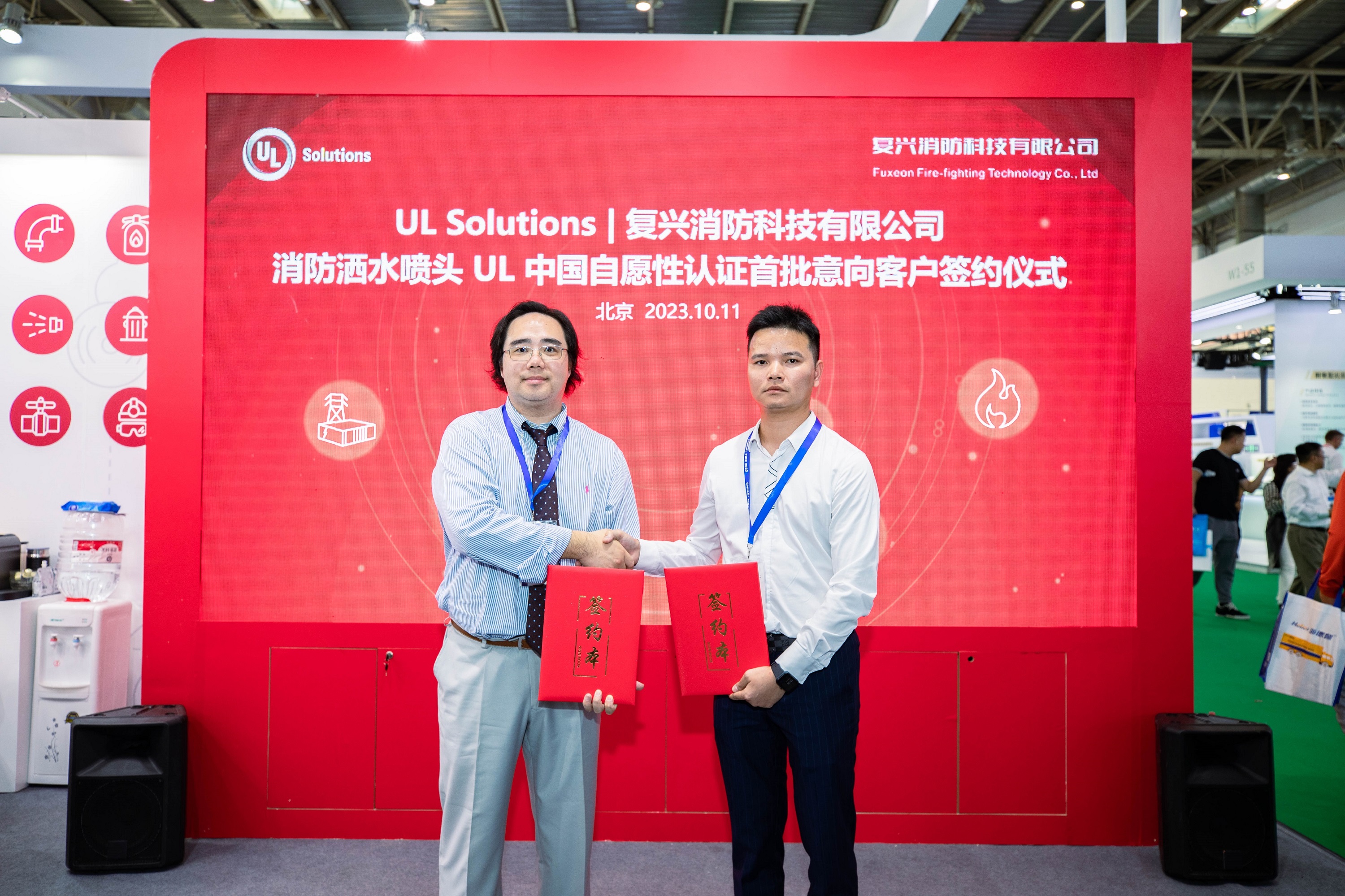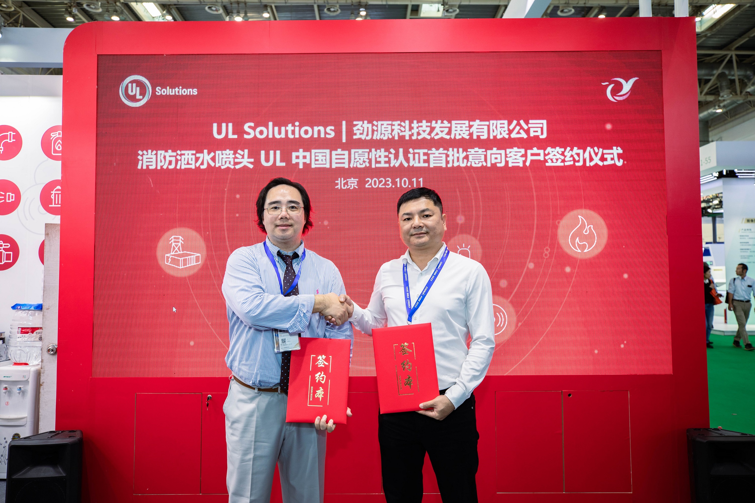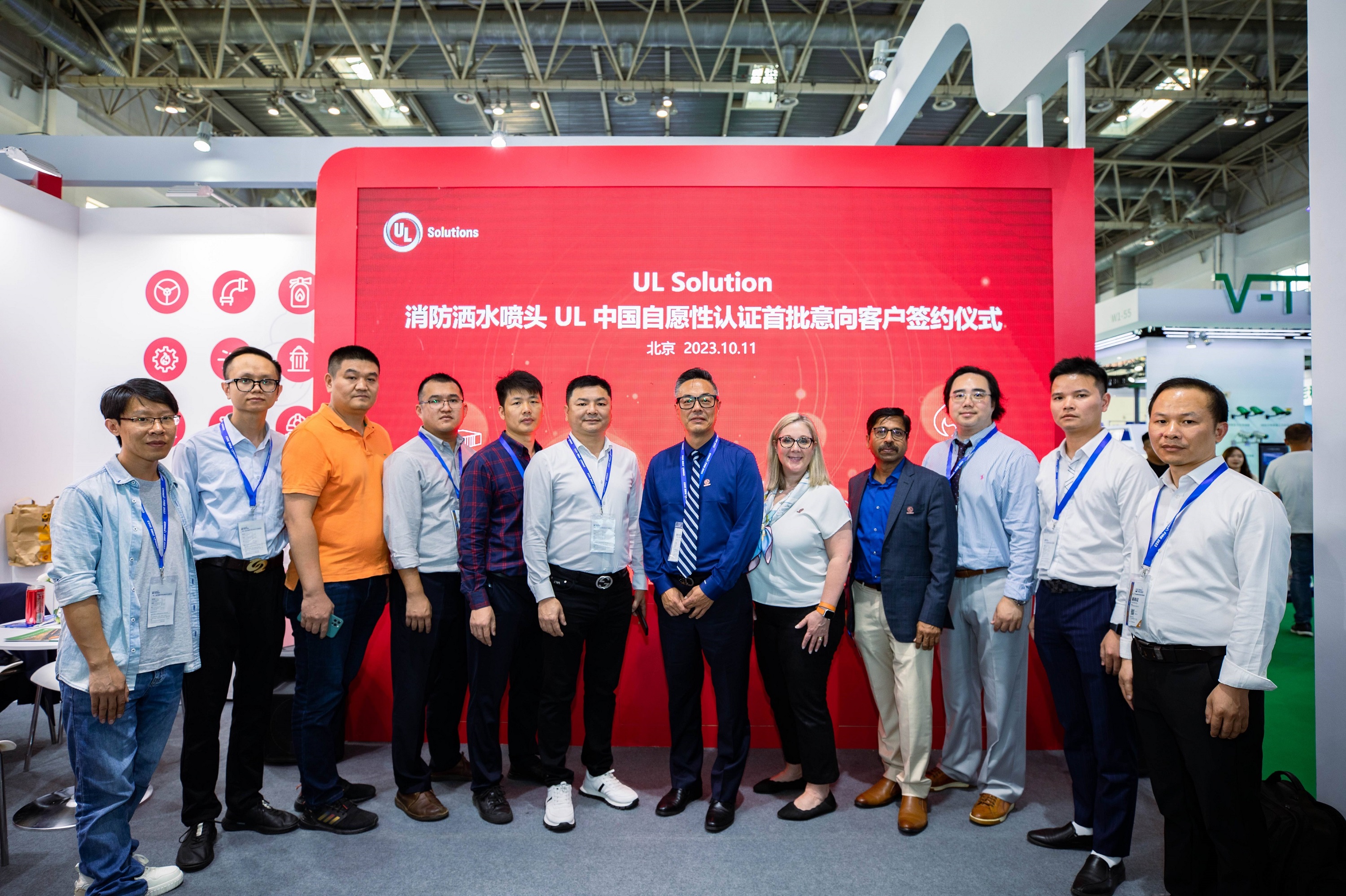 本届消防展,UL Solutions带来了UL中国自愿性认证第二个产品品类 – 洒水喷头,旨在为应用广泛的自动喷水灭火系统提供强有力的技术支撑及品质保障。UL Solutions与UL中国自愿性认证洒水喷头首批八家意向客户举行了签约仪式,共同推动UL喷淋头自愿性认证方案落地。