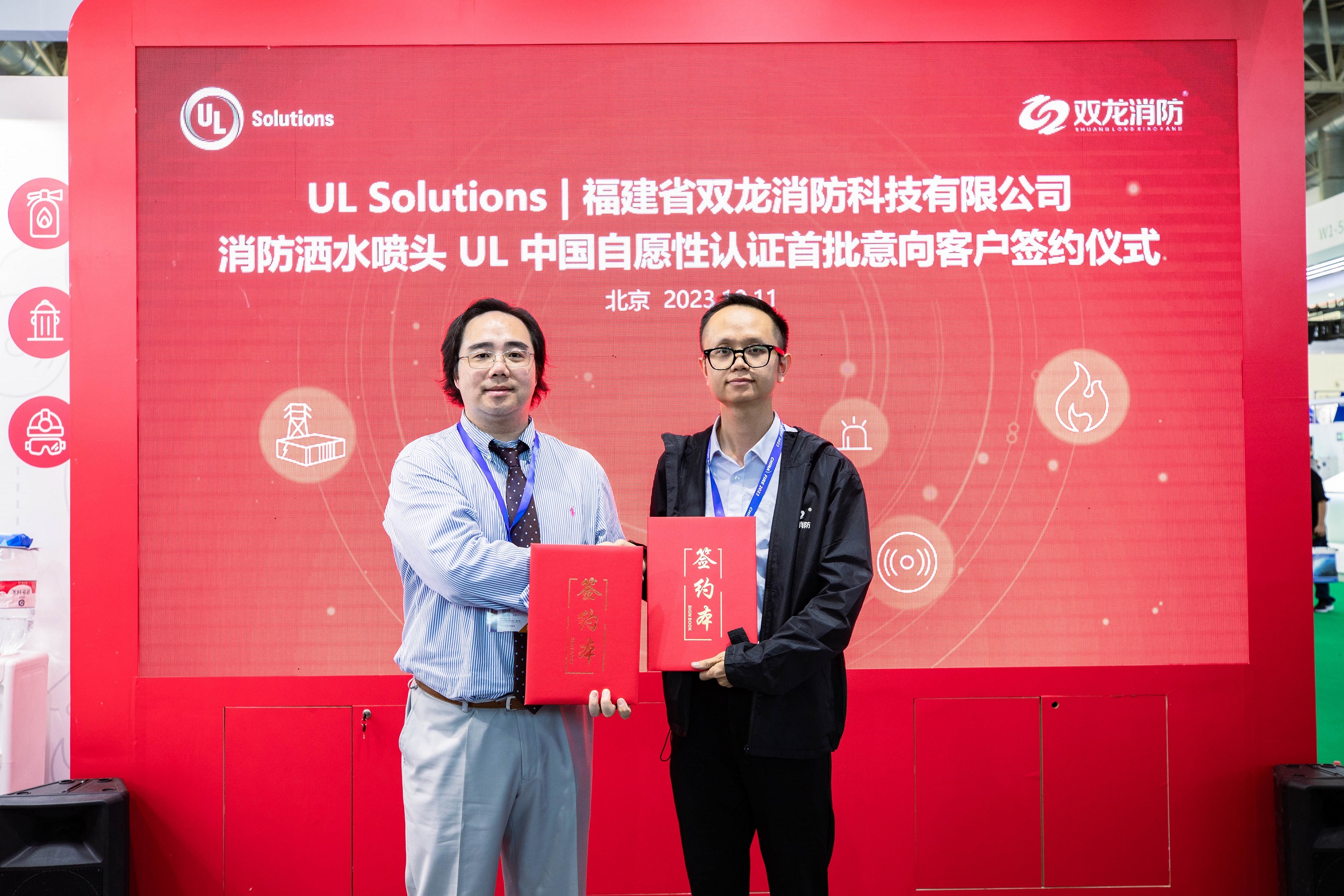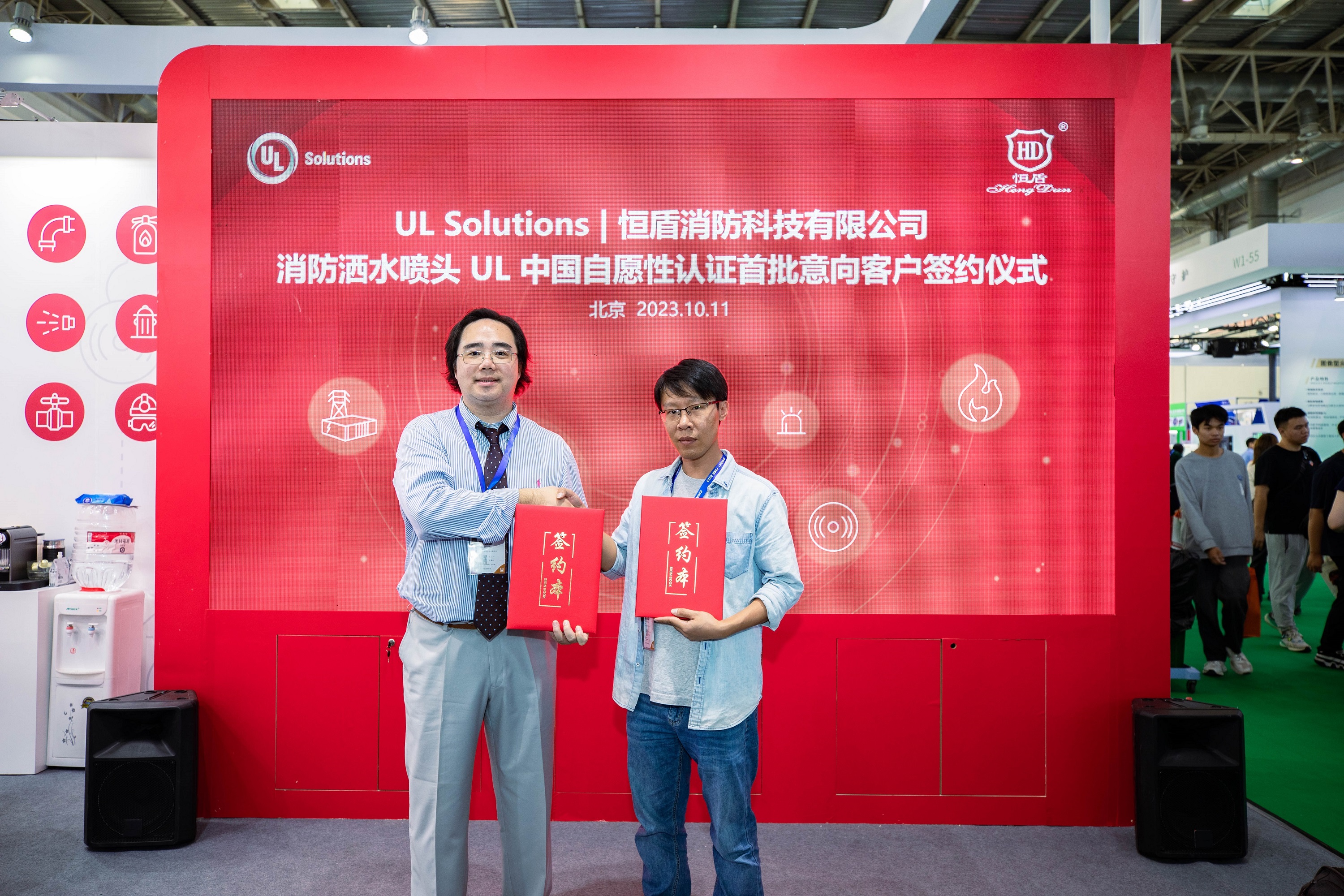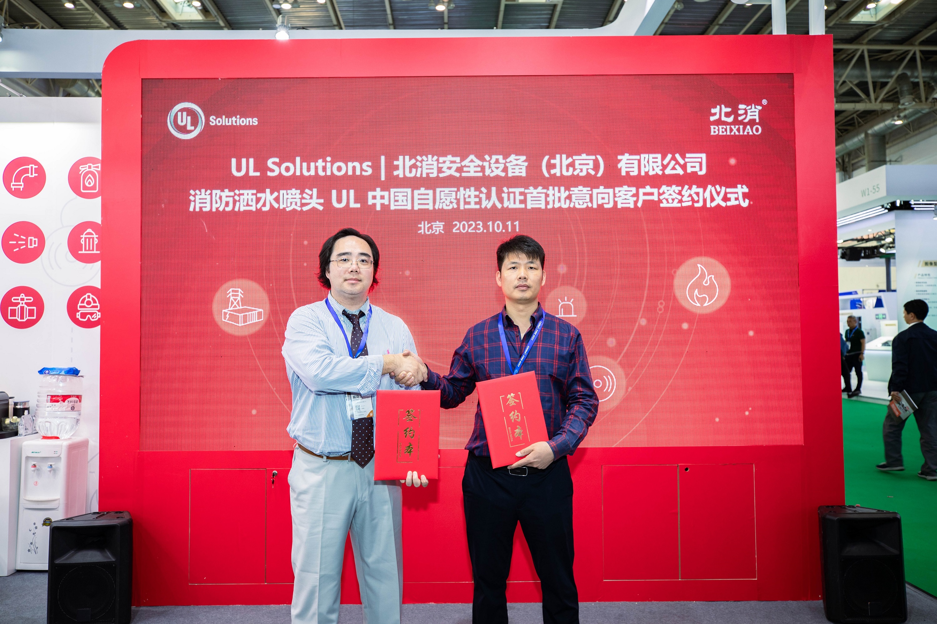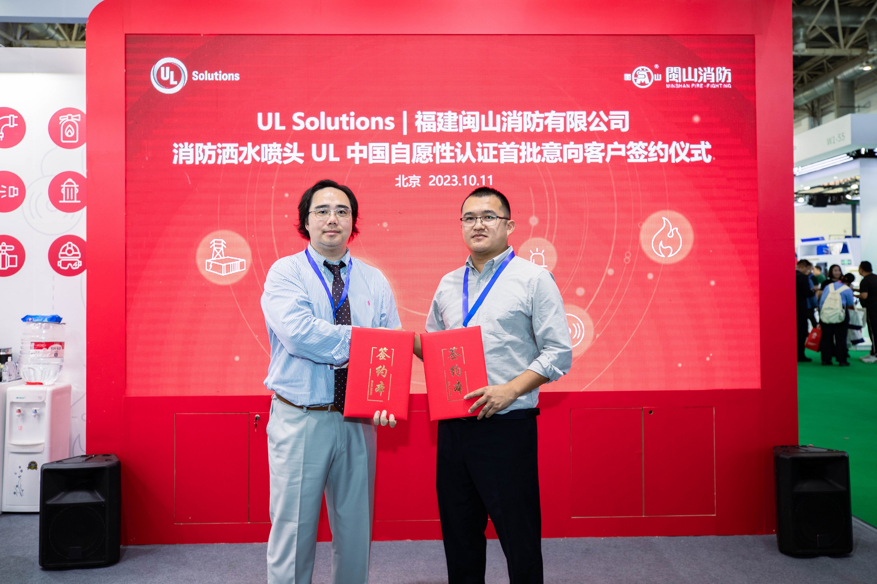 本届消防展,UL Solutions带来了UL中国自愿性认证第二个产品品类 – 洒水喷头,旨在为应用广泛的自动喷水灭火系统提供强有力的技术支撑及品质保障。UL Solutions与UL中国自愿性认证洒水喷头首批八家意向客户举行了签约仪式,共同推动UL喷淋头自愿性认证方案落地。