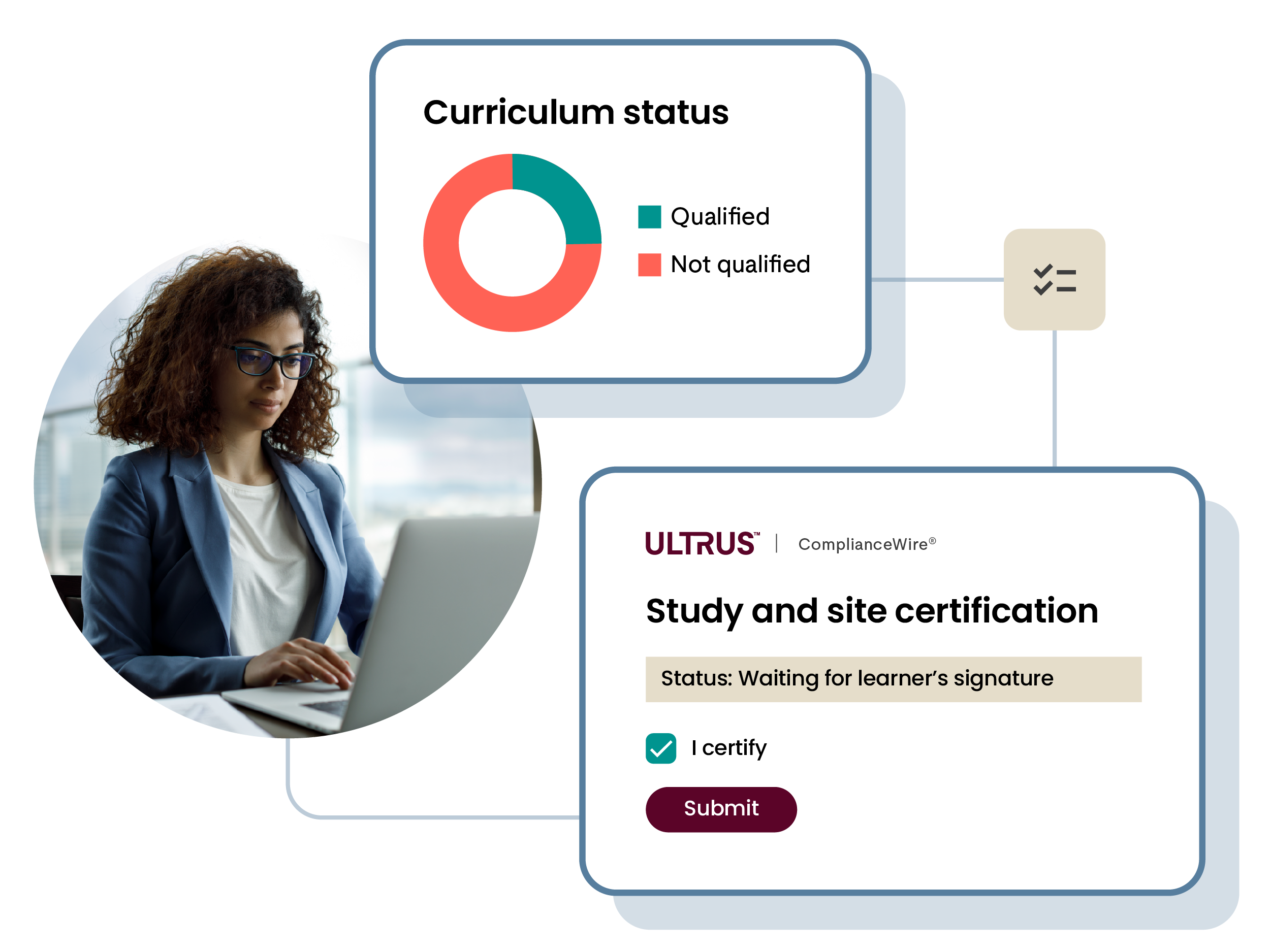 轻松与研究中心和站点沟通并对其进行监控,跟进稽查后发现的问题,如纠正和预防措施(CAPA)、产品召回及其他法规义务。ULTRUS ComplianceWire 临床资质确认可根据您的特定生态系统需求进行灵活配置。上传培训、资质和政策以维持合规性。